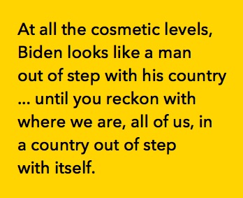 Yes he’s messy, he’s sloppy, he blows through social boundaries when he shouldn’t, he’s almost too effusive in a deeply standoffish era. At first (or even second) blush, at all the cosmetic levels, Biden looks like a man out of step with his country ... until you reckon with where we are today, all of us, in a country out of step with itself.